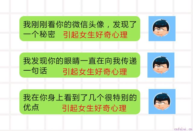 出于好奇心,女生会过来问你她有什么优点。如果你想继续引起女生的好奇,你可以先告诉她两点,如:有爱心,有品位,很友善等等,到第三点的时候说:第三点我不能说,说了你就不会这么做了。