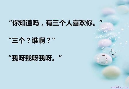 2、一般女生对有多少个人喜欢她,是相当感兴趣的。如果你告诉她有三个喜欢她,她可能会在心里猜想是谁,也会好奇地问你。然后你回答我呀我呀我呀。虽然很有可能会被打,但是她心里绝对会开心的!