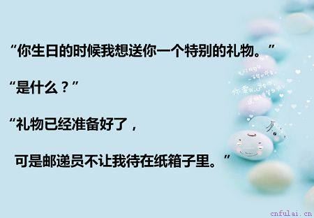 3、喜欢的女生过生日送礼物,是最正常不过的事情,但是直接说送自己有点太俗,如果你换用以上的这一种说法,女神肯定会觉得你幽默又有趣!