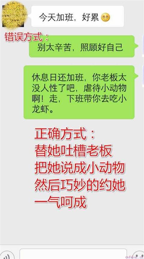 这样的夸赞,直接就夸到了女生的点上。其实这段对话中,女生真的会辞职吗,根本不会,她只是想听你的甜言蜜语,她只是想在自己累的时候找个依靠,找个人安慰她一句。你简单的一句甜言蜜语一扫她一天的劳累,既显示了你的心,也表达了你的爱,又让女生在心里好好感动一把,三全其美。