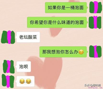3.把女生比喻成一桶泡面,问她希望是什么味道的,只要她一回答你,那么你就直接告诉她,我想泡你,因为泡面就是用来泡开水吃的,这也是很让女生无解的。