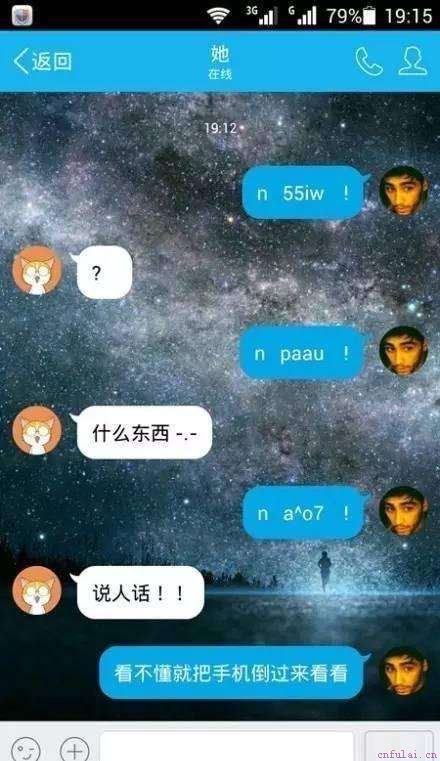 这个套路相信很少兄弟用过,先打几个莫名其妙的字数,女生还觉得你是神经病,但是没多久,转折会让她措手不及,因为当女生把手机倒过来的时候,全都是情话,我们看着都辣眼睛。