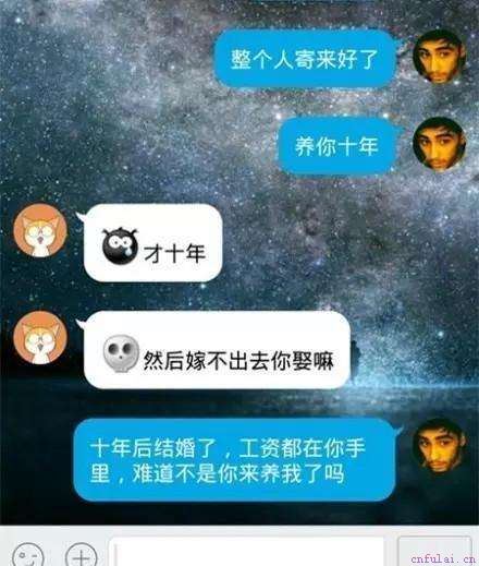 “我养你啊”这个台词相信大部分男生都听过了,但是怎么把她用到和女生的聊天上,这就是一个难题了,跟女生说把她寄过来,养她十年,接着女生也挺配合,故意跟你说嫁不出去怎么办,十年后女生都和你过日子了,默认成交玩的可以