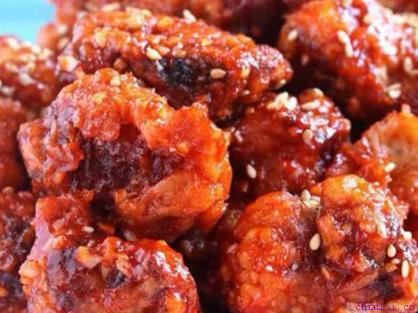 5⃣️另起一个锅,把酱料倒入锅中快速翻炒,将炸鸡倒入搅拌均匀,撒上2g白芝麻
