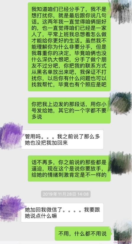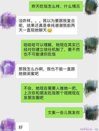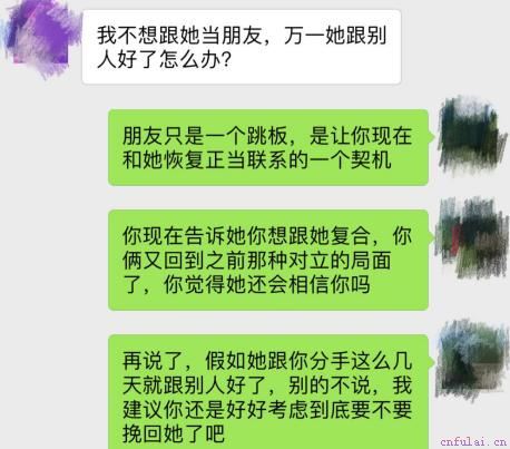 所以这里我给小浩的建议,就是让他制造一个追求他但是他并没有答应的对象,让女友产生竞争意识和危机意识,从而促使她迈出承担责任的一步,这也是挽回中常见的化被动为主动的方法,只要对方肯迈出这一步,挽回就可以宣告大功告成了。