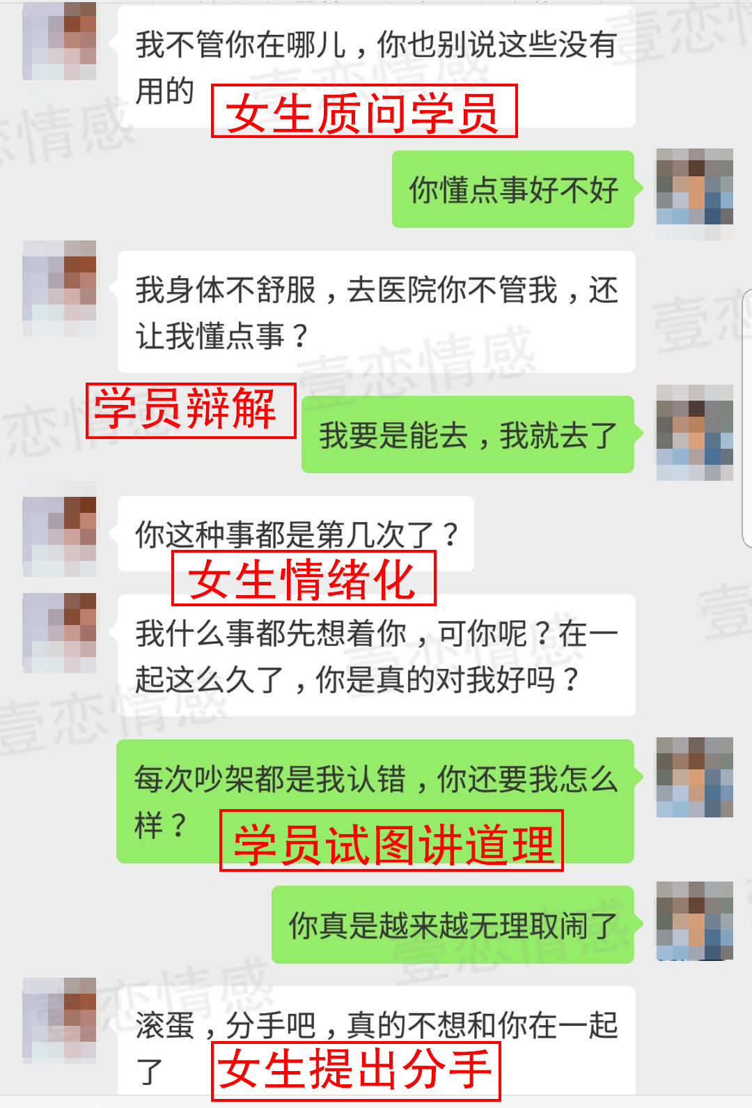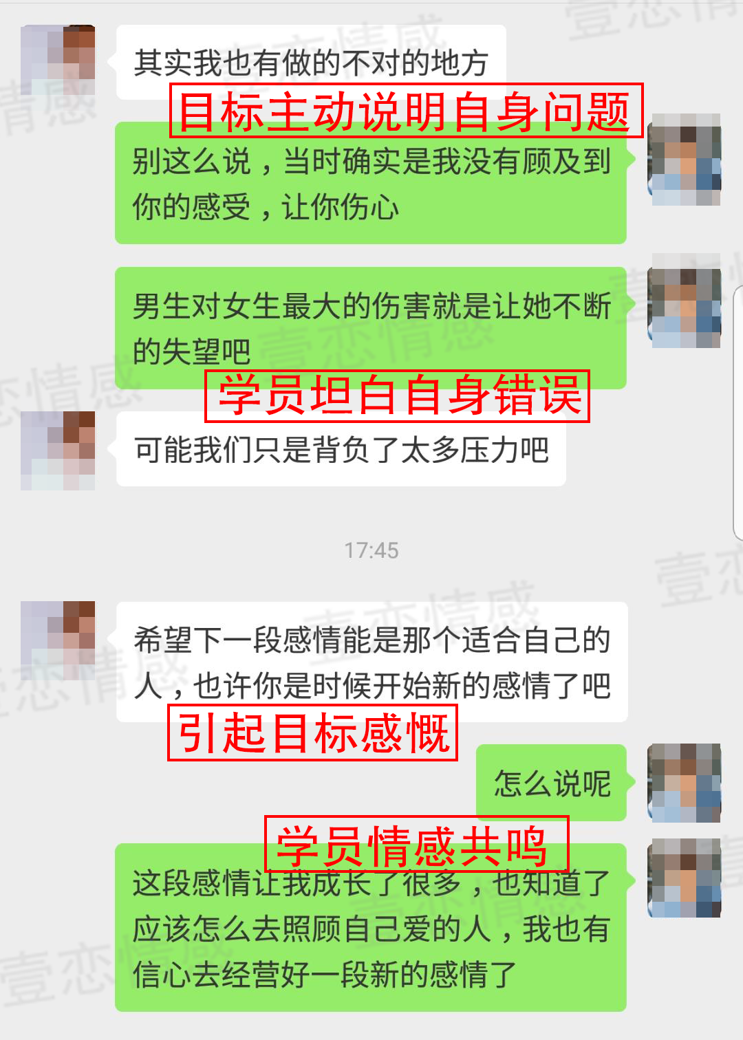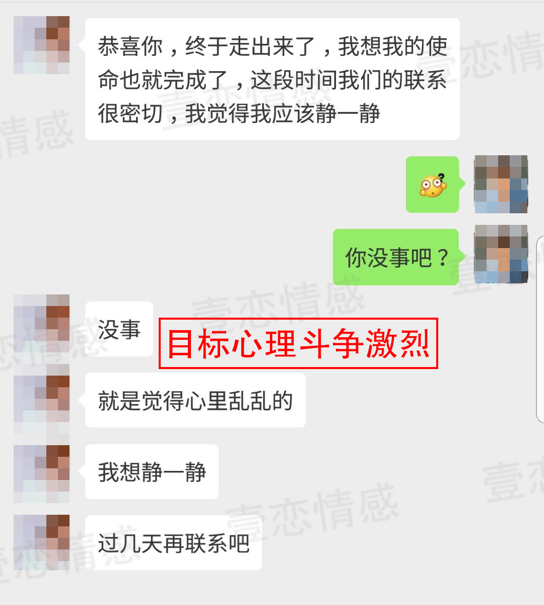 不要对目标施压,以理解和认可的姿态去和对方沟通,让目标对你的态度缓和下来,然后再通过针对性的聊天、互动技巧和事件安排去扭转对方对你的看法,重新建立她对这段关系的信心。在进入服务之后,我们首先为周雷进行了心态建设,帮助他走出自己的内心焦虑期。