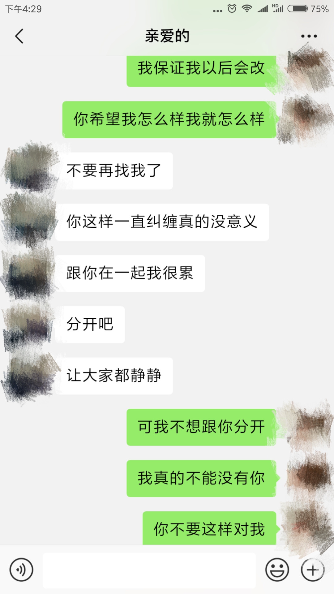 分手之后,我天天吃不好睡不好,发疯一样地想他,我不知道为什么我们会走到了这一步,我无数次想到我们以前在一起甜蜜的时光,我觉得我不能没有他。我开始疯狂给他发信息打电话,但是他冷漠的态度让我伤透了心,他说我们彻底结束了,说跟我在一起很累,让我别再纠缠他了。