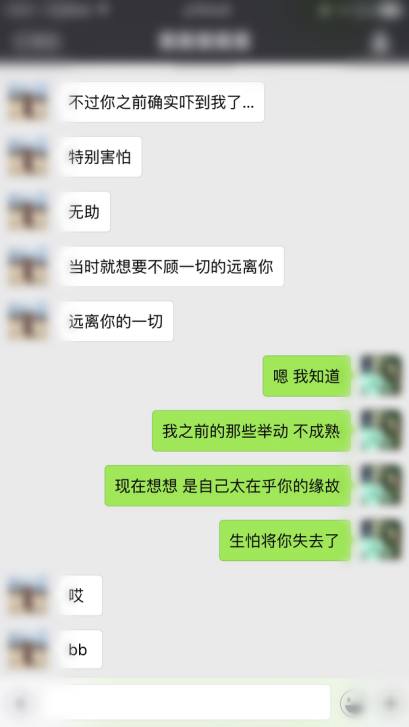 于是我知道错了,是我自身的敏感和占有欲彻底的毁了我,无法控制自己的情绪在女生看来会显得不够成熟,也会增添她内心当中的恐惧。