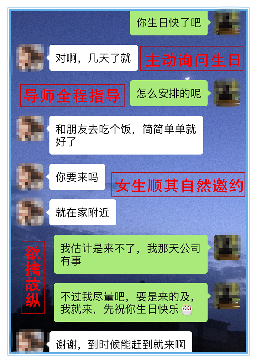 经过导师全程指导,学员和女友聊了一段时间之后,态度越来越好了,这时候,就要让学员约女友出来见一面了,这样就可以让女友看到学员的改变,还可以改善俩人的关系。刚好就快到学员女友的生日了,导师认为这是一个很好的机会,所以就以生日的话题来邀约女友,这样就能避免被拒绝的尴尬。