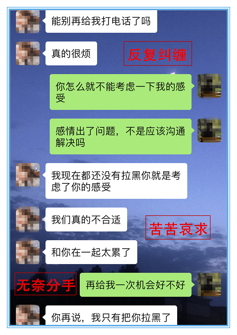 分手初期,在女友强烈的抵触情绪下,学员依然还在用电话,微信对女友进行轰炸。学员误以为这样做能换来女友的原谅。其实,这样的方式只会让情况更加恶化,死缠烂打是没有任何效果的,女友只会更加坚定要分手。你如果在跟女友相处的时候,也总是吵架闹别扭,让女友对你彻底失望的话。那就可以现在点击右边的按钮#微信#,添加导师微信好友,就能马上获得专业的挽回分析,导师还会在微信里面1对1帮你解决各种情感问题,让你的女友马上回心转意。
