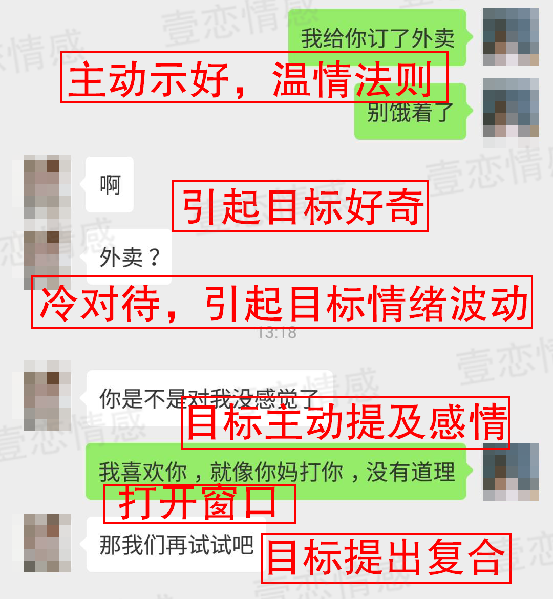这是温情法则和花式呵护,没人能拒绝寒冷时候送温暖的人。对方开始主动抱怨最近工作辛苦,经常吃不上饭,导师安排露露顺手在网上订了牛奶面包给他,导师交代给学员,对方冷淡的时候不要去黏着他,他找你有事的时候,你也可以根据情况推掉一下。有一天中午,对方突然问露露是不是对他没感觉了。导师教露露这样回他 我喜欢你,像你妈打你,没有道理。对方回他,那我们再试试吧。
