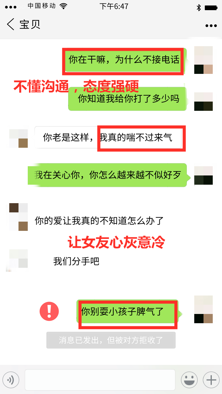 分手后,要避免挽回雷区,不要死缠烂打,而是想方设法降低她对你的反感度,这样你再去联系她的时候才不会被抵触。像学员一样,如果继续打电话,肯定会被删掉或者拉黑,我们就让他赶紧停止这种行为,让对方的对她的负面情绪随着时间变淡。利用这段断联时间,反省分手的深层次原因,并有针对性的解决两人之间的问题。