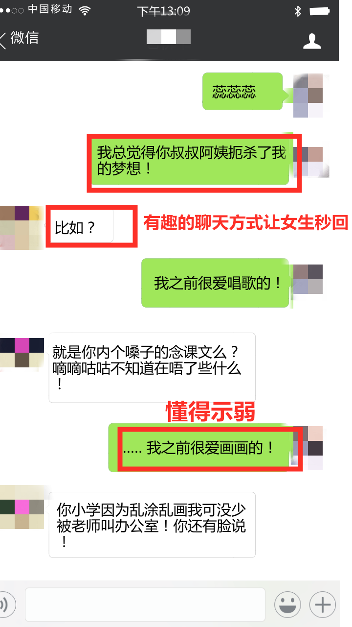 七天之后,我们帮助学员进行编辑一条种子短信,信的内容是我们老师根据学员逐句推敲过后的,让学员发过去,发过去之后,一天没有动静,学员急坏了,我们让他保持一个无所谓的心态,第二天早上,女友发了两个字:嗯嗯。我们开始指导学员进行展示面以及朋友圈的打造,怎么发,发什么,都经过严格的筛选。四天后,女友给学员的朋友圈点赞了,也会回应学员的微信消息了。