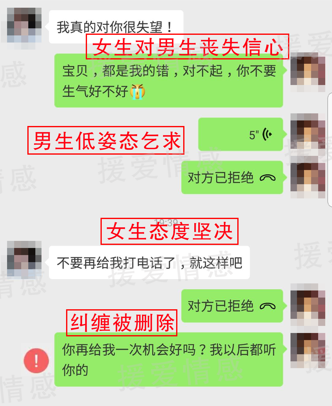 挽回核心问题:不会解决矛盾、付出太多、感情投资失衡、丧失价值、不会引导对方投资、错误挽回挽回过程必须严格按照咨询师团队的指导,挽回过程也是自身重塑的过程。按照咨询师指导,如何发信息,如何打电话,咨询师教你如何回复信息等等,并为你分析每一步操作的思路,代入式的帮你提升情商。