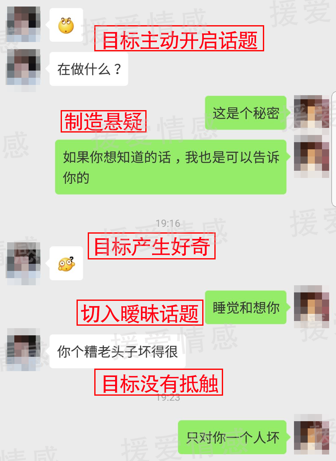 一段时间的朋友圈展示后,对方开始点赞学员朋友圈,这说明学员的改变得到对方认可,我们开始安排学员聊天切入,同时验证学习成果。我们指导学员改变低姿态的聊天方式,聊天以撩拨对方情绪为目标,并且主动撤离,在咨询师的帮助下,学员表现不错。