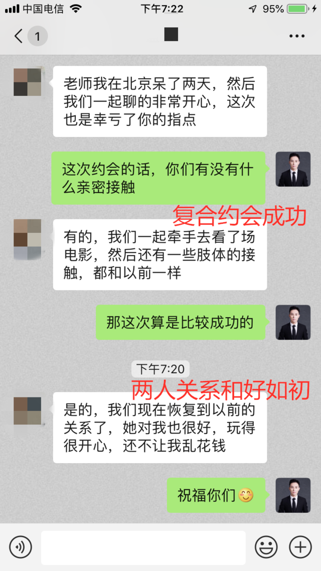 经过老师指导,学员和目标女生几次的互动下来,聊的很少,但是句句精辟,学员在情感控制上已经掌握了主动权,那么这个时候就应该去坐做一些努力去找到女生,同时给足她安全感。我们让学员进行了模糊邀约,女友没有拒绝,我们让学员这一次驱车来到了北京,制造了一场偶遇+惊喜,两人就近坐下来聊了聊,这次两人是敞开了心扉,学员也是表达了现在的想法,两人顺利复合。