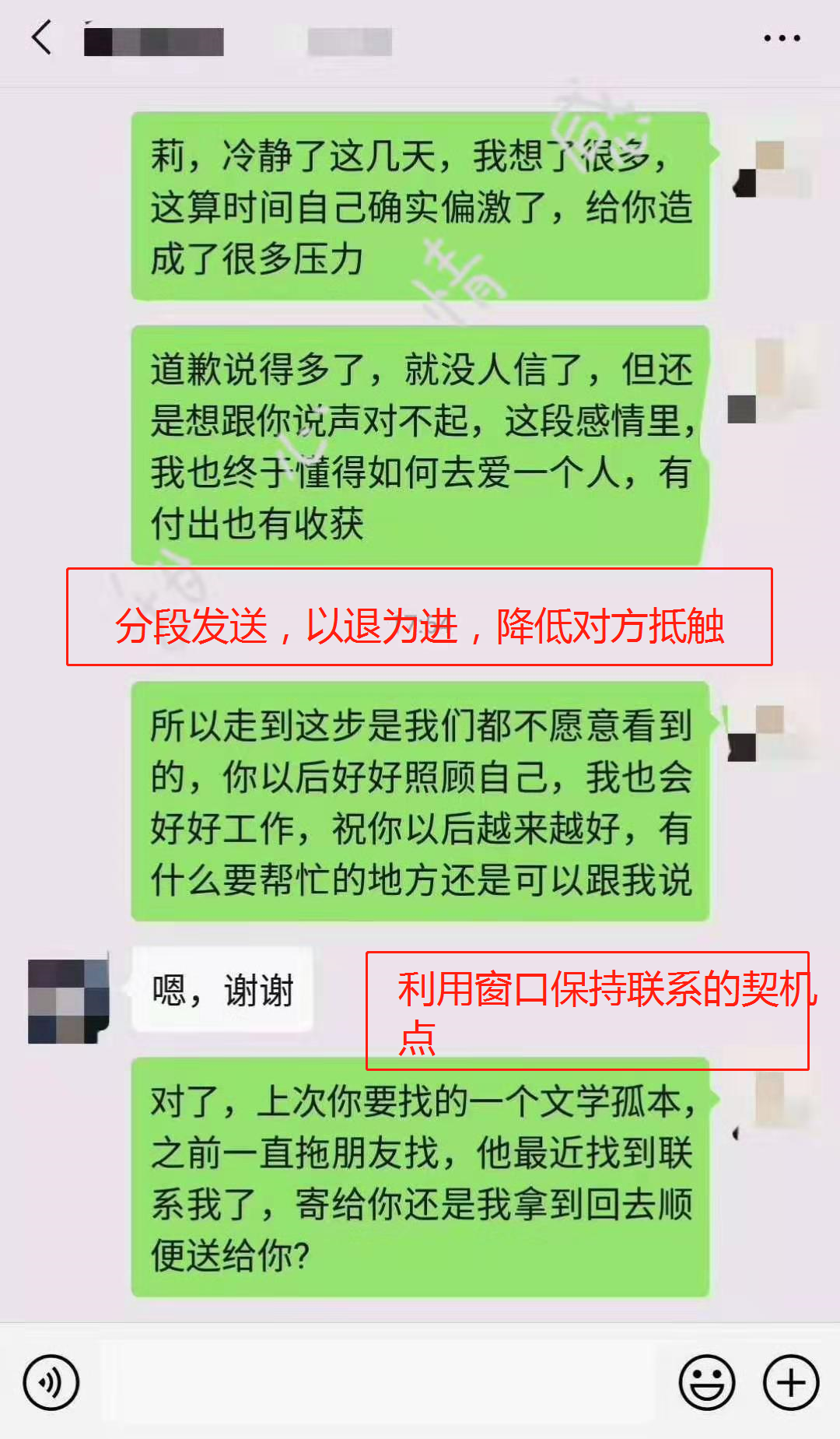 由于之前的纠缠,对方会无论你发什么都不会回复;及时地以退为进,接受双方已经分手的事实;对方会渐渐进入到之前感情的回顾期,回想你们之前感情的美好时刻;对方也没有了再抵触你的理由,会反思是否是自己太过小题大作,这样的话术需要通过不同女生的不同性格分析,无法盲目套用。这样的专业话术可以保持双方的一个联系窗口,也同时给女生空间引导对方进入感情的回顾期。