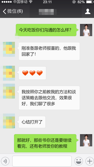 好的心态会让挽回成功的几率更大。我在求助的前期,心态非常差。几乎是声嘶力竭地要求咨询师马上帮我挽回婚姻,让陈旭马上回家。咨询师说,在挽回过程中,经常遇到这样的女学员,每天茶饭不思,一上来就希望能看到效果。