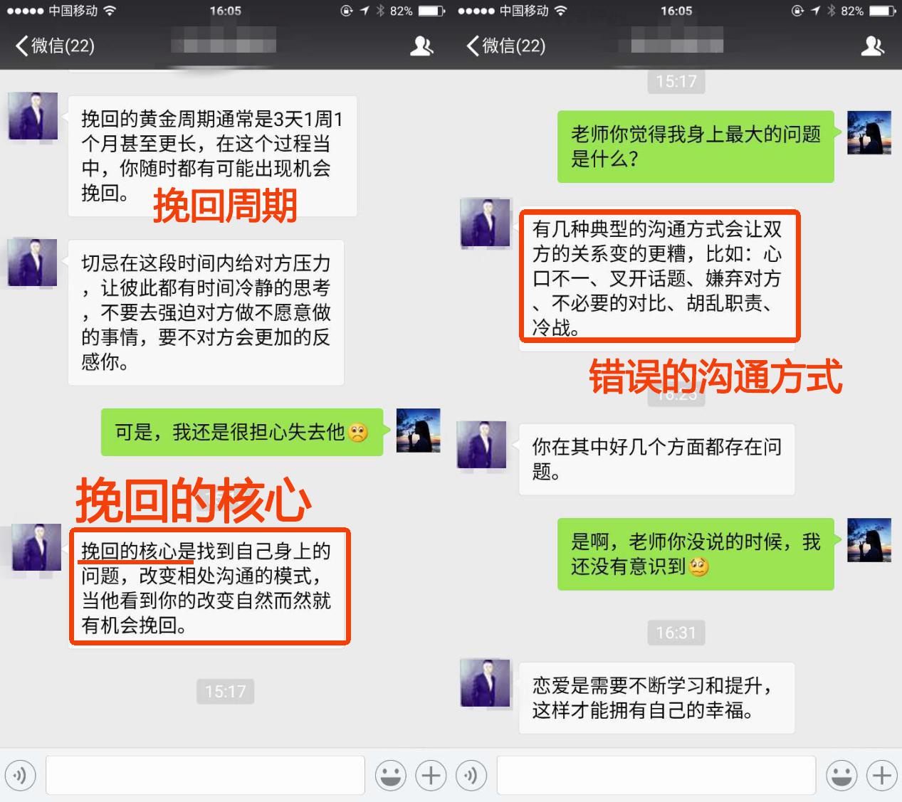 经过大A咨询师的教导,我用一个星期调整好了恋爱的心态,之后又用了一个星期来学习男女交往的技巧,这个时候我突然好像突然开窍了,原来自己对于爱情的理解是那么的浅薄。 老师觉得我已经准备好了,可以开始下一步跟他的联系了。通过老师团队的策划,大A咨询师让我运用最有效的挽回手法,大A咨询师手把手的指导我,教我如何用细节激发过去的美好回忆。