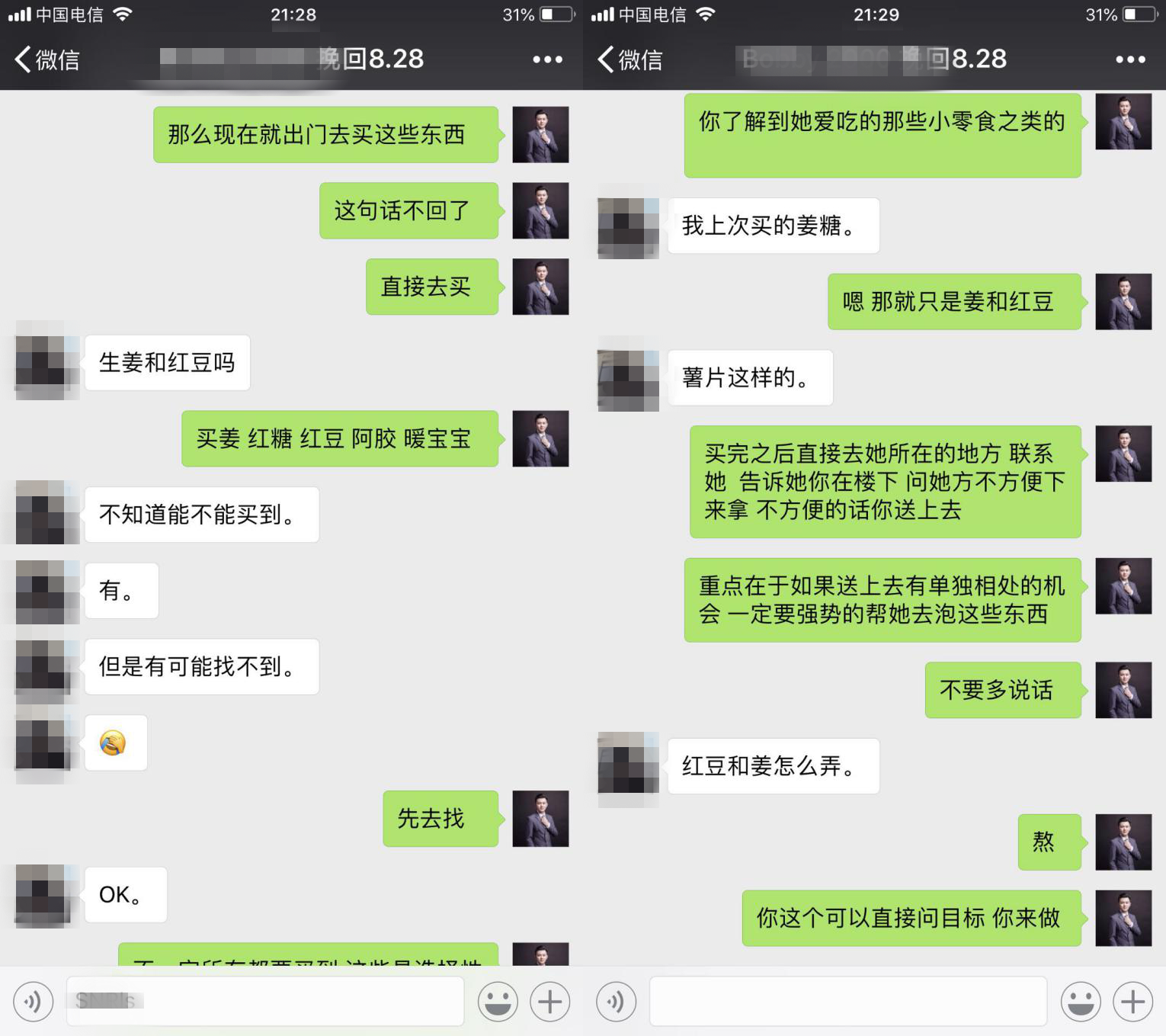 在买好了这些东西的时候,学员找到目标,目标一开始因为自身的顾虑加上女性特有的矜持,习惯性拒绝的态度给到的反馈是让学员直接放在目标家门口。这个时候学员心态有点绷不住了,在我的强势指导下制造了见面单独相处的机会: