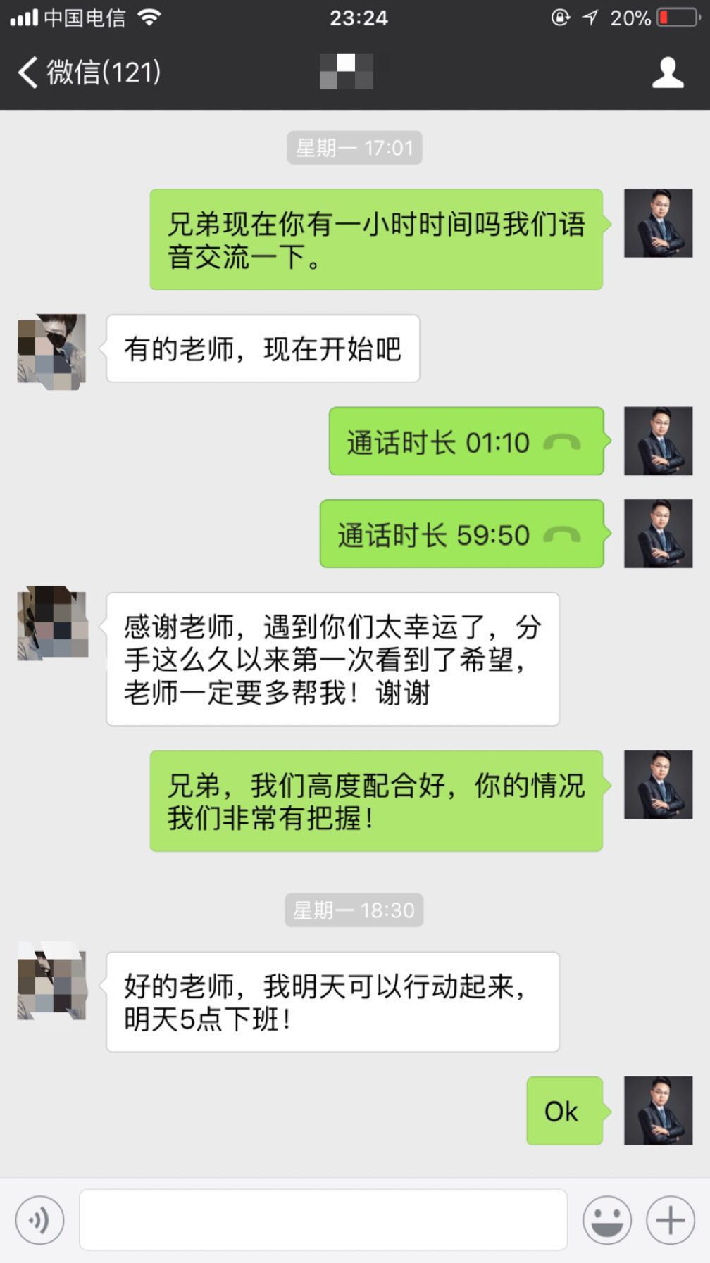 如果说挽回成功是百分之一百,那么良好的心态,决定了挽回成功的百分之五十,你可能会遇到很多挫折,但终点是光明的。在与学员了解情况的过程中,我们发现学员心态严重颓废,缺乏自信,萎靡不振,情绪一度失控,通过辰辰咨询师一个多小时的语音指导,调整学员心态,找到挽回的信心。