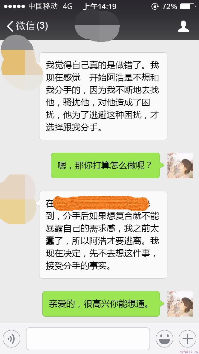 小美的状态实在是可怜,而且看得出,她确实对阿浩情深义重,于是,我给她推荐了情感急救专家。小美疑惑地问我:安然姐姐,这真的能够帮助我吗?我回答道:现在阿浩已经离开你了,更确切地说你压根就找不到他,难道你在家坐着他就能回来吗?与其坐以待毙,为何不放手一搏呢?小美听取了我的意见,强忍着悲痛,报名了情感急救专家服务。我有三天没有收到小美的任何信息,第四天,我正和咨询师吃饭,小美给我发来微信,经她同意,我截取一段发出来。
