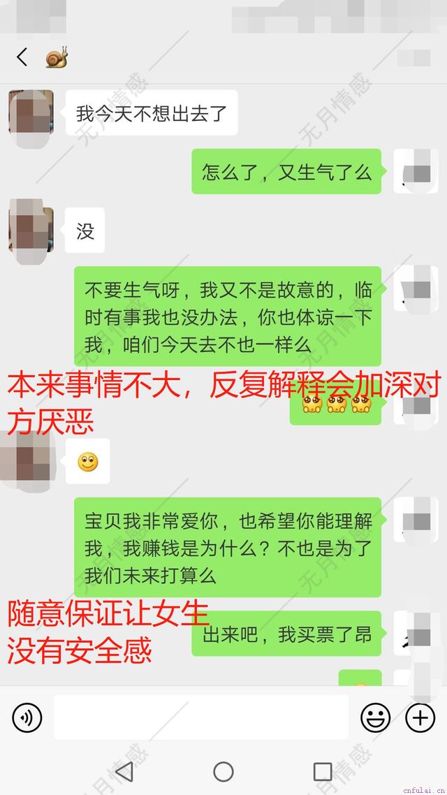 我知道她已经不那么爱我了,为了维护爱情,我变得如履薄冰,我希望能用真心和付出去打动她,可是换来的却是她的不理解和无动于衷。首先,我觉得作为男朋友,我知道她不会做出越轨行为,但是我要保护自己的女朋友不被坏男人欺骗,所以我担心静静信任不轨之人。