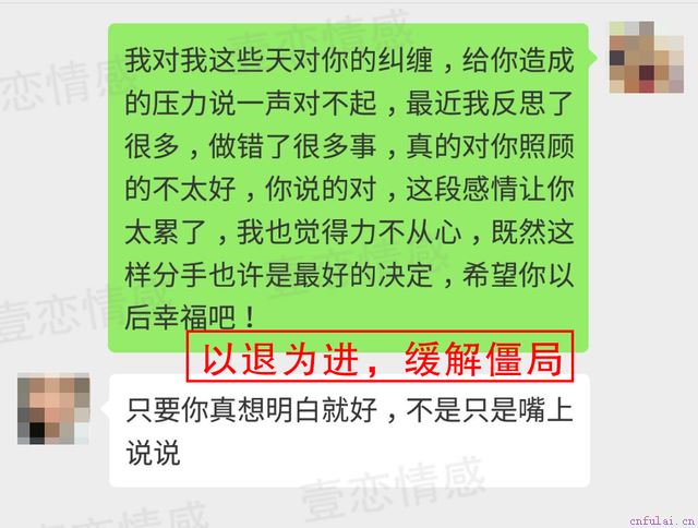 听完咨询师的讲述后,我终于明白自己的分手原因了,也对挽回有了信心。咨询师很快针对我的特殊情况制定了一份详细的挽回计划。现在妍妍对我的矛盾对立情绪正处于高峰期,而且分手后,我又纠缠她骚扰她,严重打扰到妍妍的正常生活,给她造成了很大的压力,她对我的厌烦已经到了顶点。这个阶段,如果我再去跟妍妍保持正常联系,几乎是不可能的,所以咨询师让我通过微信向妍妍表态,已经接受分手关系,用以退为进的方式,首先消除对方对我的一部分负面情绪,为后面的挽回做铺垫。