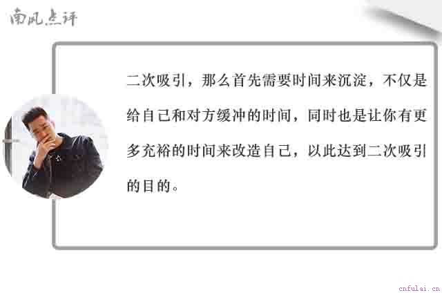 二次吸引的关键就在于经过一段时间的冷处理之后,给对方呈现的是一个崭新的、对对方来说足够有魅力的自己,就跟比赛一样,只有自身实力足够强大,才能真正的占据主动权。畏畏缩缩,不敢于去改变自己,在爱情之中,畏手畏脚的人永远没法去改正自己的错误,从而挽回自己想要的那个她。