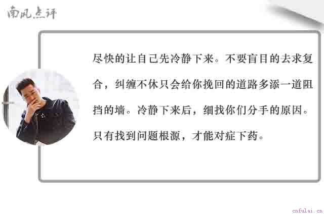 感情破碎后怎么挽回?分手总是一件让人非常难过的事情,眼睁睁的看着曾经陪伴自己最熟悉的人,一步步的离自己而去,那种无能为力的感觉,想必体验过的兄弟都不想再回首一次。想快速挽回心爱的她,或者追到自己喜欢的女神,添加我,我帮你快速搞定!为什么说跪舔没有用?其实原因很简单。靠乞求与跪舔换来的和好,也仅仅只是依靠着对方一时的心软所换来的。并没有从根本上去解决问题,实际上只是一种掩耳盗铃的表现,看不见的问题,迟早还是会浮出水面,不代表问题不存在。今天,南风团队就来给大家在新年之前,送上挽回的重磅干货,来帮助各位兄弟们捋清楚自己在爱情之中,所面临的问题以及在挽回之中应该注意的地方及应该避开的雷区。