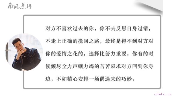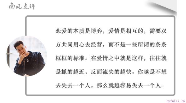 南风点评:兄弟们,是不是看到了你们自己的影子,对方在你们交往初期对你们还是非常喜欢的,相处也融洽,可以随着交往的深入,你性格里的敏感、占有欲强等特点全部暴露出来,对方也对你一天比一天冷淡。这就是并未参透恋爱实质的原因。