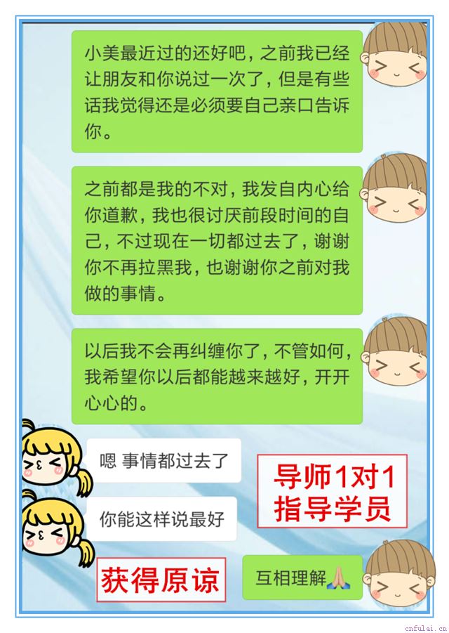 一段感情的开始,不是无缘无故的,一段感情的结束,肯定会有原因,想要挽回她,就必须找准分手的关键原因,然后对症下药去解决。如果你连原因都不清楚,只能盲目的采取行动,降低挽回的成功率。也许你不知道怎么让她原谅你,也许你不知道怎么做才能复合,也许你不知道说什么话她才会理你。但是,风度导师可以很负责任的告诉你,只要你成为我们的学员,这些通通不是问题,下面就是我们学员的复合案例:别人都可以挽回成功,为什么你不可以呢?不要给自己找那么多理由和借口,挽回的机会把握在自己手里,只要你肯努力,你也可以达到学员这样的效果,和自己心爱的女人幸福的在一起!