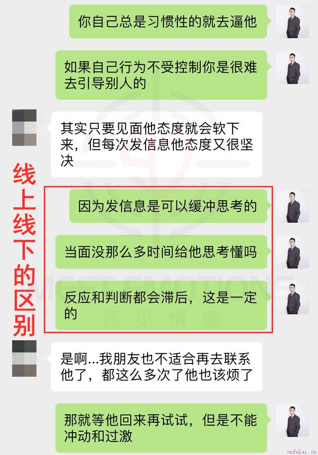 其实有这个疑问的人真不在少数,但咱哪儿有的选择,能按照正确路线走的人多半都是因为弯路走的太多了,深知做错的苦头,实在不想再犯错了。而在这种情形之下,没有取得预期目标,但是没有犯错,这就是进步。之后女学员问我,只要我联系他,他永远不会放弃对我的怀疑的吧。他既然想跟我聊感情,我为什么不和他好好聊聊呢?这样和逃避有什么区别吗?也许有这个想法的人不在少数。