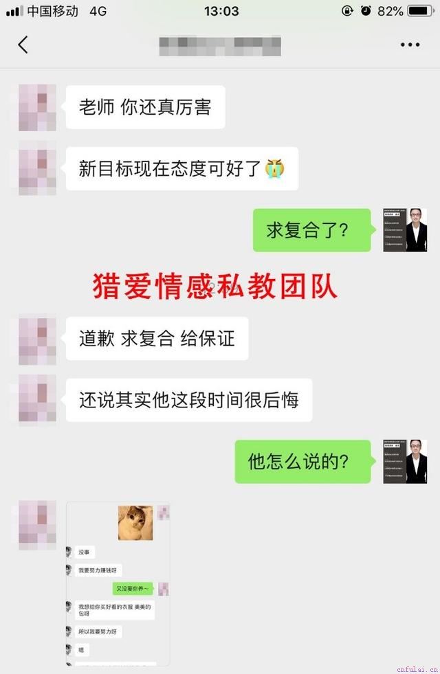 因为A女士在挽回中已经给到了很多关心价值,而男方是非常需要关心和陪伴的!所以在一小段时间的加强提供后,我们使用反撇,效果非常明显,男方一下变得失魂落魄,不受控的开始频繁找A女士,并且不自觉开始讨好A女士。当然,A女士后面还用到我们前面提到的深层次沟通技术等技巧。双方感情经过这一次的危机,反而是越来越好,上了一个台阶,双方都更了解对方,并且意识到对方对自己生活的重要性。双方的感情回到正常轨道上。