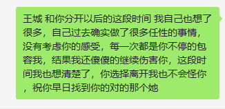 后来我就有点莫名的焦虑,觉得还没有结婚都是这样子了,那以后结婚了还得了,我就开始有些作了。但是我的本意实际上只不过是想引起他的注意,可是他好像并不了解我,我们之间的隔阂和矛盾也就逐次慢慢加深。最后一次争吵是在今年的9月份,当时我气疯了,就直接拿下个月的订婚宴去威胁他,原本想着他就服软了过来哄我,结果他只是愣了一下,然后啥话都没说,就直接摔门而出。就这样我们之间三天都没有说话,后来我想了想,觉得自己确实有些过分,就服软过去找他,可是却换回来他的先分开一段时间,我当时受不了这个结果,大哭大闹,可是他连哄都没有哄我就走开了。