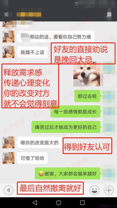 一旦女友决绝分手,她的闺蜜们一定会站在她的一方,并且理性的为朋友的幸福考虑,所以这里,发动朋友说情是不可取的。你依然可以由朋友圈评论切入,跟目标的一位闺蜜、朋友建立合理沟通,注意这里不要请求对方帮助你挽回,一定要跳出挽回的情绪,表达自己在这段感情的收获很大即可。