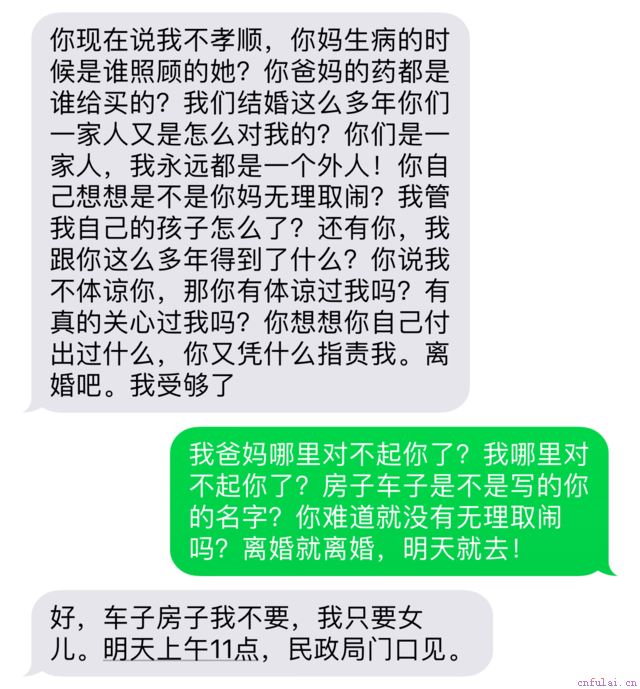 冲突爆发:这个时候我也很生气。同时,面对家庭和工作上面的压力我的情绪也开始爆发。我给她打电话,接通以后我说她不孝顺老人,不体谅我。在电话里我们彼此都说了很难听的话,最后她吧电话挂了,给我发来一条短信说要离婚。当时我也是一时冲动,答应了她。