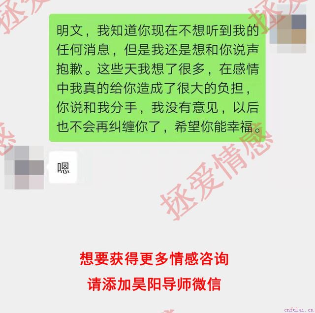 毫无疑问,李玉正属于后者,男方已经明显暴露想远离她的想法,可是她还在死缠烂打,给对方施加压力,最后导致二人关系下降到冰点。为此,昊阳导师第一时间给她进行了心理疏导,目的是释放李玉内心的心理压力,修复分手创伤,用一种相对平和的心态去面对分手的事实,积极地投入到挽回的操作中去。为了让目标放松戒备,降低他对李玉的抵触情绪,昊阳导师根据两人的情况编辑了一条微信信息,让李玉发给明文,用以退为进的方式来使两人的局面尽可能的得到缓解。