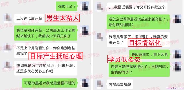 我们不难发现,学员后期对这份感情充满不安,想要靠控制来抓紧对方,结果适得其反。学员总是粘着对方,一方面给对方造成了很大的压力,影响了相处的舒适度,另一方面也显露了学员的价值缺失,暴露了学员的不自信,男性魅力进一步丧失。
