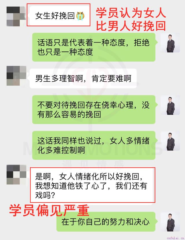虽然有点心塞,但是还是得尊重别人的意愿。之后这位女生又说看了别人的挽回成功的案例表示挽回应该很容易。但其实真心想要挽回的人几乎没有几人是没有心态崩溃过的,不论男女!我听过太多的学员哭过了,年龄小的,年龄大的,都听过,情到深处哭的那是一个稀里哗啦,到这姑娘这儿成了很容易的事儿了,所以说人还是不能随意的下结论,因为该女学员之后心态也崩溃了,往后看就知道了。只是在这里要告诉很多的女生们不要有这种挽回的误区,不要觉得所谓的男人挽回女人好挽回,女人挽回男人不好挽回,这些观念本就是错误的。