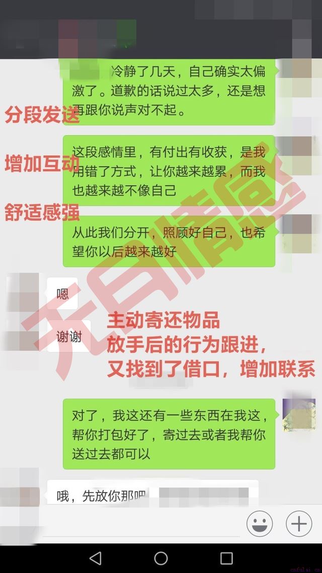 告知对方放手,相当于给过去的纠缠划下句号,软化了对方的态度,消除了丽丽的戒心,同时降低后续行动中的情绪障碍。经过分析,我们安排阿亮做进一步断联,这次只断联三天,目的是为了降低对方戒备心。