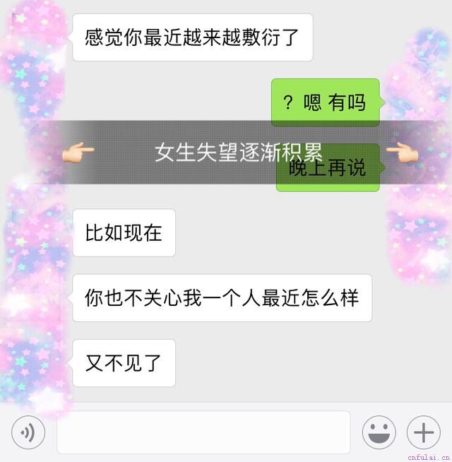 在这个案例中,男女生的矛盾可以说是无中生有,到最后闹得不可开交之时,两人之间也没有什么大矛盾,其实就是男生在和女生的交流过程之中,没有顾及到女生内心的真实想法。又因后续工作压力与生活压力的双重加压之下,导致了情绪的崩溃以及后续回到家乡之后的一系列错误措施而导致把情况越搞越糟糕。和妹子在关键点交流的时候一定要注意好扬长避短,暴露过多的短板,只会让妹子觉得你越来越不靠谱,不值得依靠。