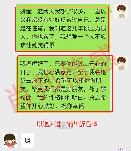 发此信息的目的,是为了降低对方防备心和厌恶感,表明自己已经接受分手这个事实,不会继续纠缠给她带来困扰,同时也能减轻自己单方面付出产生的压力。沈妍霏从一开始的不愿理睬,到现在回复了信息,说明我们的操作确实起到了相应的效果。但是沈妍霏的回复只是一个字,态度十分冷淡,说明她对郭宁的抵触情绪还是非常深的,这个阶段我们不应该跟女生有过多接触。
