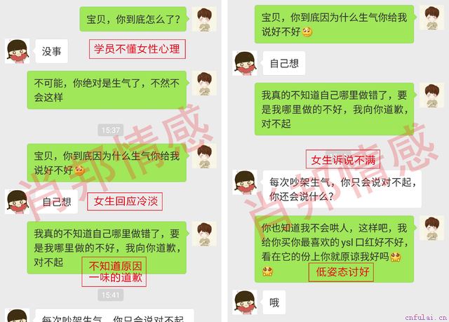 只要沈妍霏没有及时回复消息,郭宁就马上连发视频或者是直接打电话,想知道沈妍霏跟谁在一起,在哪里,在干嘛。这让沈妍霏感觉到,自己的正常工作和生活,正常社交都受到了影响。郭宁的这份爱给了沈妍霏太大的情感压力,让她感觉到自己的私人空间不足,喘不过气来。这样的行为,就会让女生的心里萌生出逃离的想法,导致分手意识萌芽。这几个点不止是郭宁所犯的错误,也是学员中普遍存在的一个男性通病。