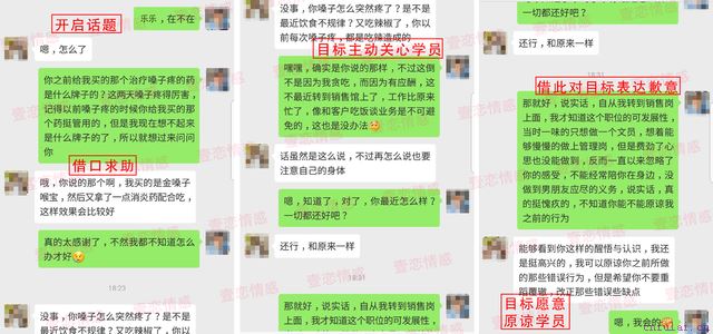 通过学员和目标在交流过程中关系慢慢升温,可以看出目标对学员态度已经有所转变,打开了复合窗口,只是这个窗口现在还不算太大,如果此时表白的话成功率只有一半。所以,之后学员在两人的接触中稳定了心态,虽说在之后聊天当中也会聊到感情话题,但是学员始终没有明确提出复合的要求。