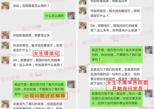 在整个案例当中,学员都是一个注重事业忽略女生情感需求的存在。刚开始女生还能理解他,知道他这是为了工作,为了将来在打拼。但是时间长了,缺少李峰对她的长期陪伴也难免会有失落。渐渐的当她发现自己一味的妥协并没有任何结果,尤其是看到李峰的付出以及努力没有任何结果的时候,她开始对李峰产生负面情绪,对他产生不满。