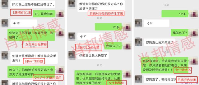 适当的占有欲可以为增加爱情的热度,但占有欲太强就势必引发男性的厌恶。在案例中,我们可以看到学员膨胀的占有欲,包括一直反感目标与同事的交涉,拒接其同事电话。在处理这些问题时,没有采用正确的方式与目标沟通,而是一再使性子,甚至自作主张挂断目标同事电话。进一步加剧两人之间的矛盾。