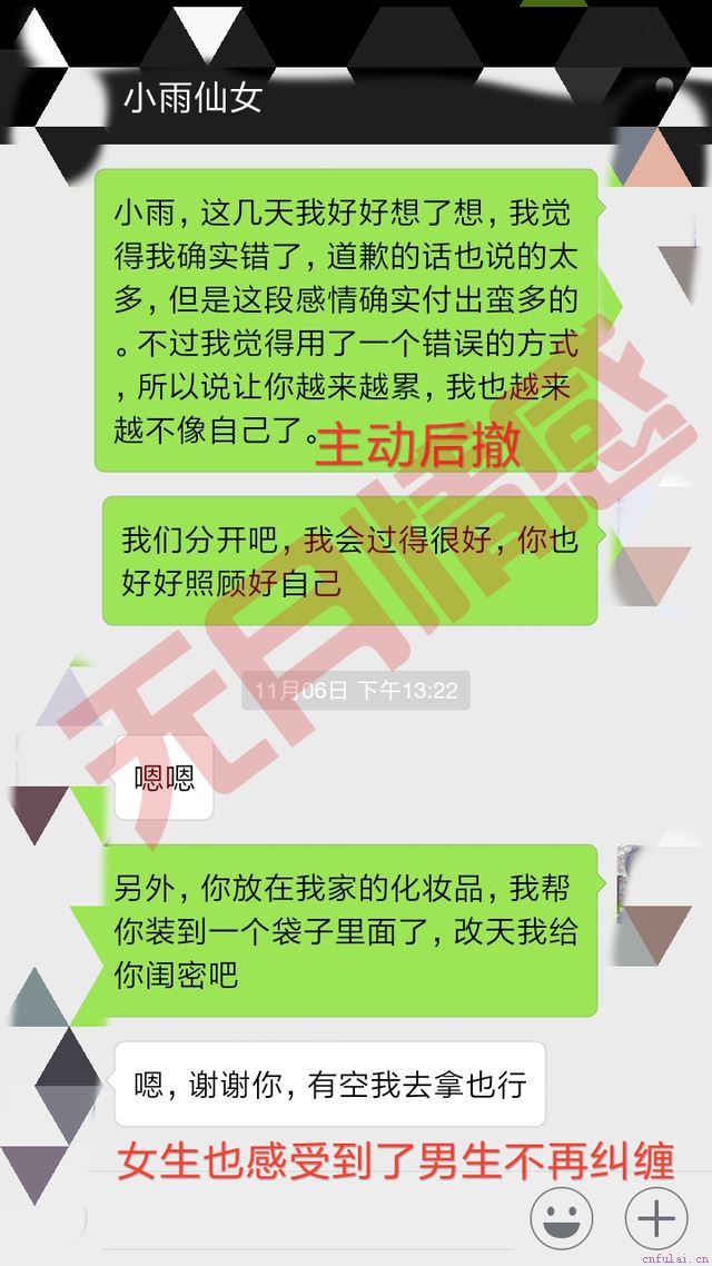 随着时间推移,两人聊天也从最开始三五天聊一次,到现在每一两天就会聊一次,而且两人关系也因为聊天修炼的升温。其实整个挽回过程就是重新燃起小雨对阿军的好感,逐渐淡化阿军负面影响,引导小雨关注到阿军的闪光点,逐渐建立起两人之间的信任感、亲密感和舒适感,最终搭建起两人之间的情感链接,之后才能走向真正的复合。在整个聊天过程中,女生可能每隔一段时间就会有情绪反复的出现,这时候通常称为女人的废物测试,因为她觉得她又在走在复合的老路上,她内心会恐惧,担心又恢复到当初的生活,所以会出现很多刁难男人的情况。