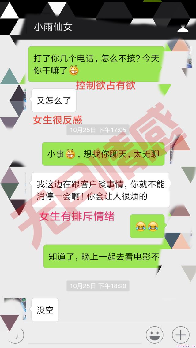 我们从聊天记录可以看出,阿军对小雨的控制欲是非常强的,想通过控制对方的方式,来抓紧对方,那小雨会本能排斥。因为控制欲,首先会影响到两个人之间舒适度,其次会暴露出学员很强需求感,女生下意识我会觉得阿军不自信甚至自卑,那男性魅力会进一步下降。