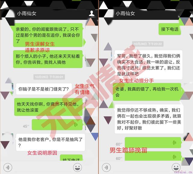 她那段时间表现让我心急如焚,我不知道该怎么办才能让她重新对我有好感,我是真心想和她走到最后,也许是因为她工作的原因吧。但是我看她和她的客户也聊得非常火热呀,所以我一直都怀疑她是不是在和其他的男人接触,所以对我没感觉了。有一天深夜,我买了她最爱吃的蛋糕店的甜点,去她公司楼下等她,我就是在那天晚上目睹了一个男人上楼去接她,下楼之后两人有说有笑上了那个男人的车子,扬长而去。我直接就打电话过去质问她,刚刚那个男人和她到底是什么关系?我们俩各自都为自己辩解,而且我扬言要去打那个男生,竟然敢给我戴绿帽子。最后她都听不下去了,也说累了,在挂电话的最后跟我说就这样吧。我能听出来她的情绪是非常失落的。第二天我就收到了小雨要求分手的微信,而且态度非常的坚决。